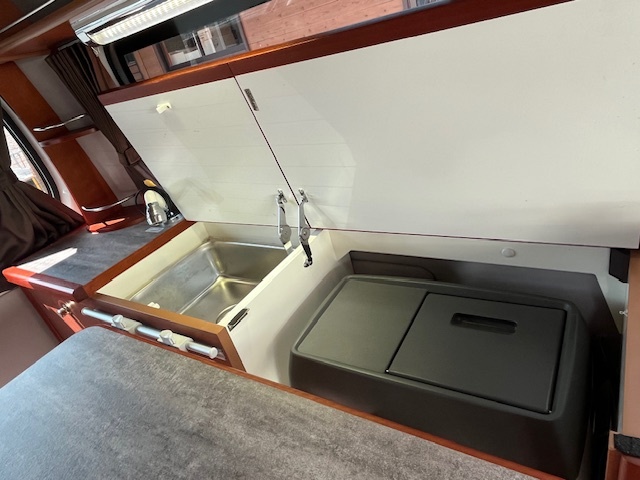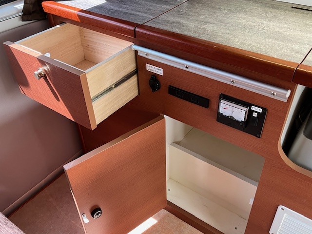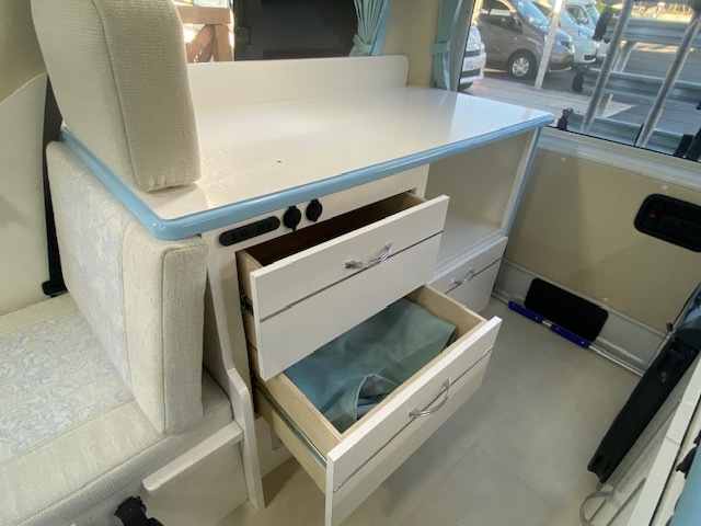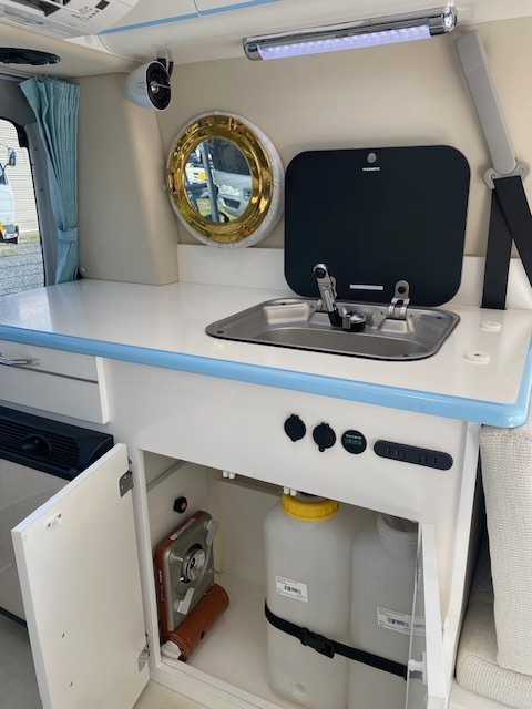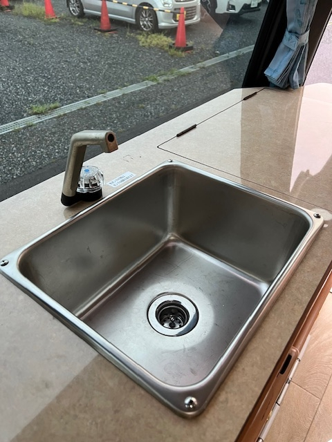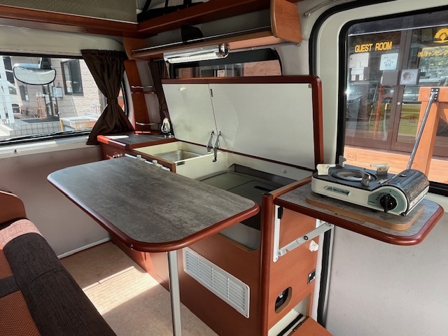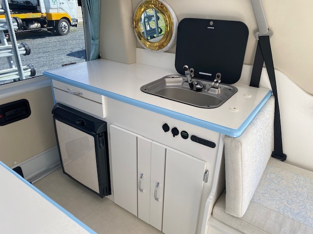 流し台が必須のキャンピングカーですが、世界にこの『ポップ・コン』だけの【ダウンギャレー】の採用で、流し台を使わない時にはベッドマットの下にダウンさせて、ベッドスペースを広~~く使うことが出来るのが最大の特徴であり魅力です。