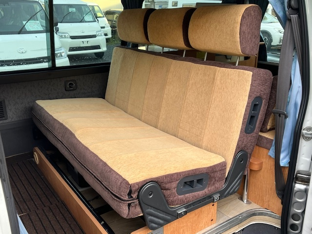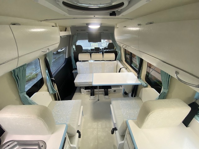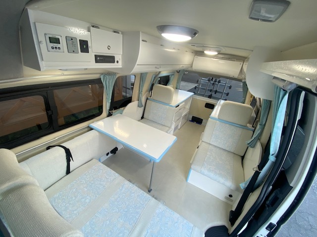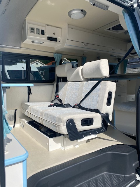 リビング部は対面にもなりますが、走行中には、全ての人が前向き乗車できるタイプですので、車酔いしやすい人やチャイルドシートの設置でお悩みの方にはご安心戴けるキャンピングカーと言えるでしょう。