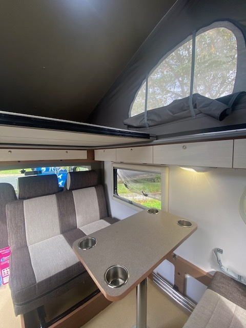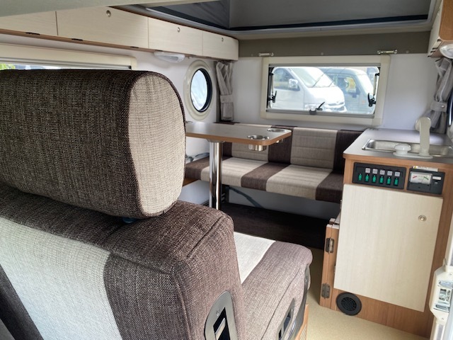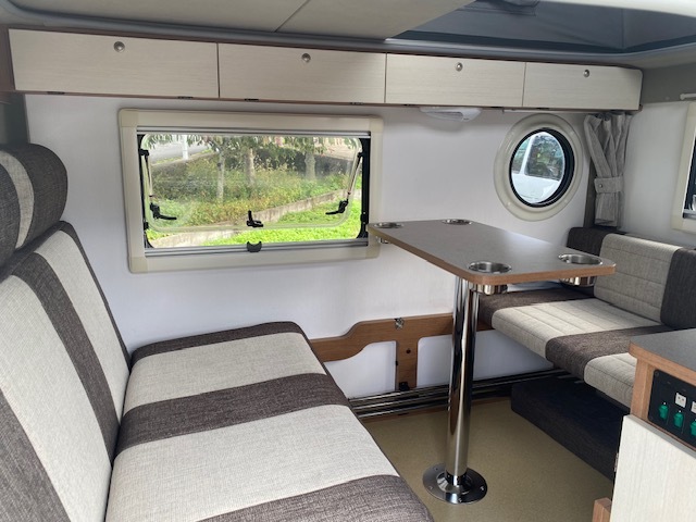 6名すべてが前向き乗車が可能、停泊時には4名対座で座れるコンパクトサイズのキャンピングカーです。